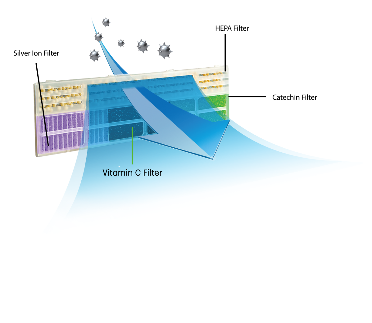 Filtru Catechin: Filtrul Catechin utilizeaza ingrediente naturale derivate din ceaiul verde, numite Catechine, care ajuta la eliminarea eficienta a bacteriilor si a mirosurilor neplacute.