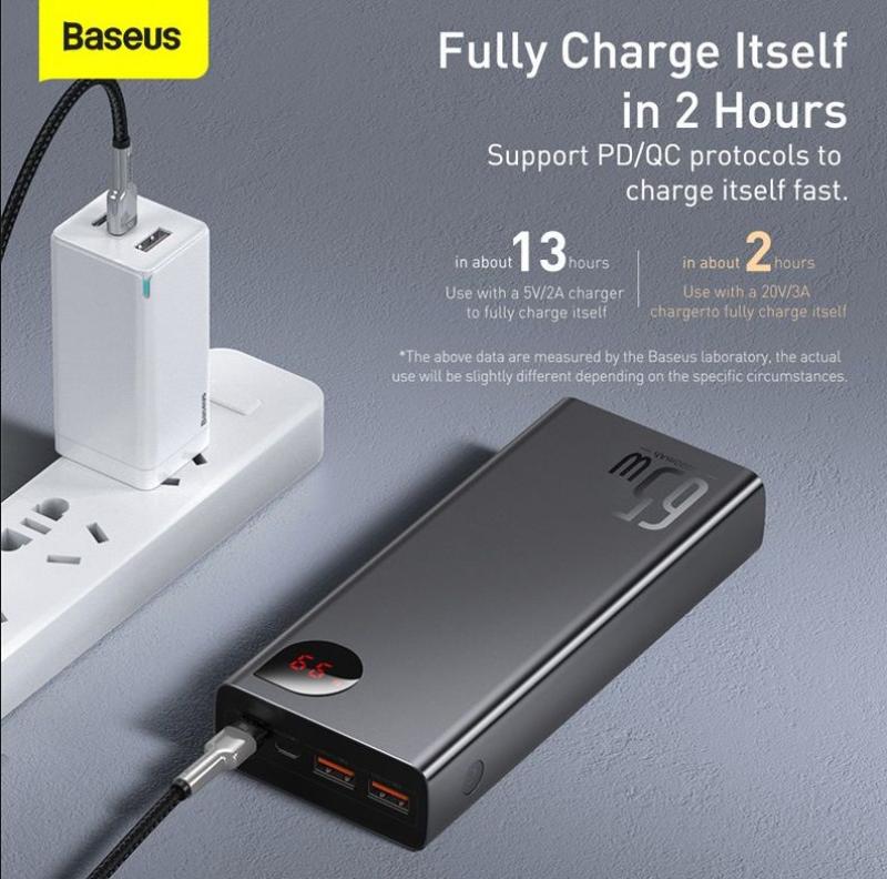 Baterie externa Baseus Adaman Metal, 20000mAh, PD 3.0 + QC 3.0 65W, 2 x USB; 1 x USB Type-C, digital display pentru status baterie, total 3A, negru