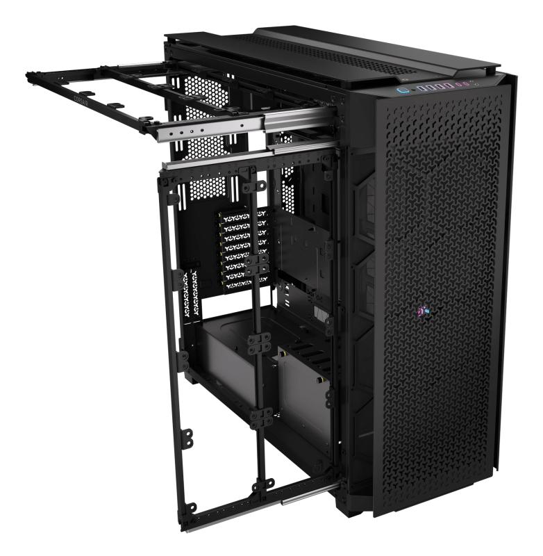 Carcasa CORSAIR 9000D AIRFLOW Super Full Tower RGB NEGRU, Tempered Glass, Sloturi Expansiune 8 orizontale sau 4 verticale+ verticale pentru placa de baza secundara, Drive Bays: 5×3.5″ 6×2.5″, Ventilatoare Suportate: 18 (spate: 2x120mm sau 1x140mm, fata: 8x120mm sau 3x140mm sau 2x200mm, lateral: 3x120mm, sus: 8x120mm sau 3x140mm sau 2x200mm), Format Placa De Baza Suportat: Mini-ITX, Micro-ATX, ATX, E-ATX, SSI-EEB, Lungime Maxima Placa Video: 580mm, Inaltime Maxima Cooler Procesor: 180mm