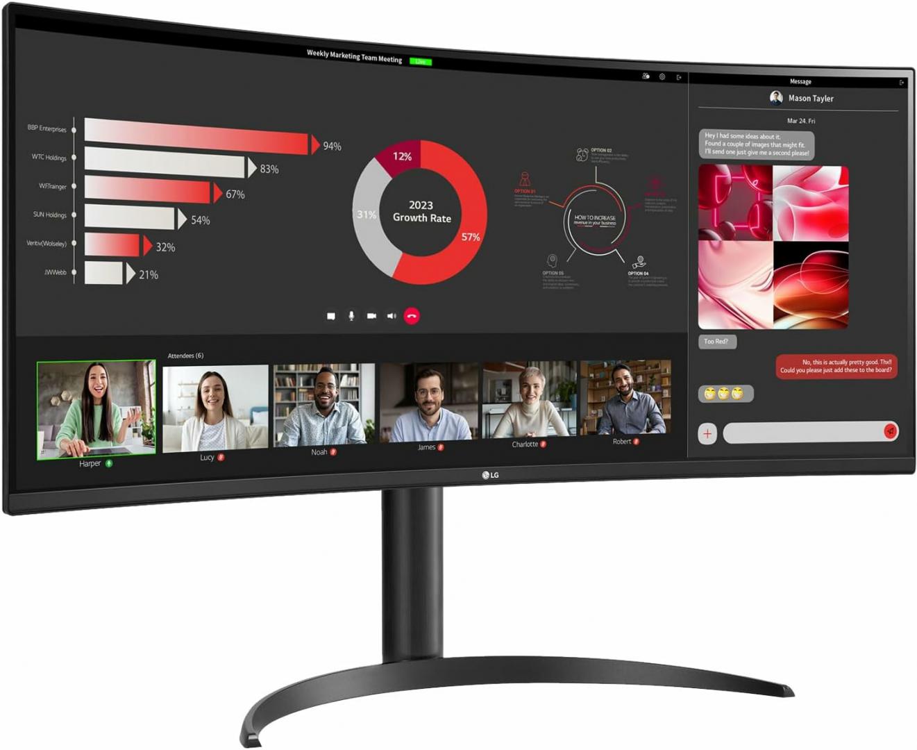 Monitor LG 34″ 34WR55QC-B.AEU, Curvature: 1800R, Diagonal (inch): 34, Diagonal (cm): 86, Aspect ratio: 21:9, Panel: VA, Resolution: 3440×1440, Refresh Rate: 100Hz, Response time GtG: 5ms, Brightness (max): 300 cd/m², Contrast (static) : 3000:1, Viewing angle: 178°/178°, Color Gamut Type: sRGB, Color Gamut Coverage: 99%, VESA Wallmount: 100×100, HDMI: Yes, DisplayPort: Yes, USB Hub: Yes, USB-C: Yes, USB-C Power Delivery: 65W, AUX: x1 3.5mm Audio OUT
