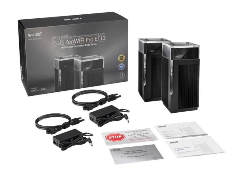 Asus Tri band home Mesh ZENwifi PRO system, ET12(2-PK) pack, AXE11000 1148+4804+4804Mbps,10 X antene interne, Tri-Band: 2.4GHz 4×4, 5GHz 4×4, 6GHz 4×4, Procesor: 2.0 GHz quad-core 64bits, Memorie: 256 MB Flash, 1GB RAM, interfata: RJ45 for 2.5G BaseT for WAN x 1, RJ45 for 2.5G BaseT for LAN x 1, RJ45 for Gigabits BaseT for LAN x 2, WPA2-PSK, WPA-PSK, greutate 1.5 kg.