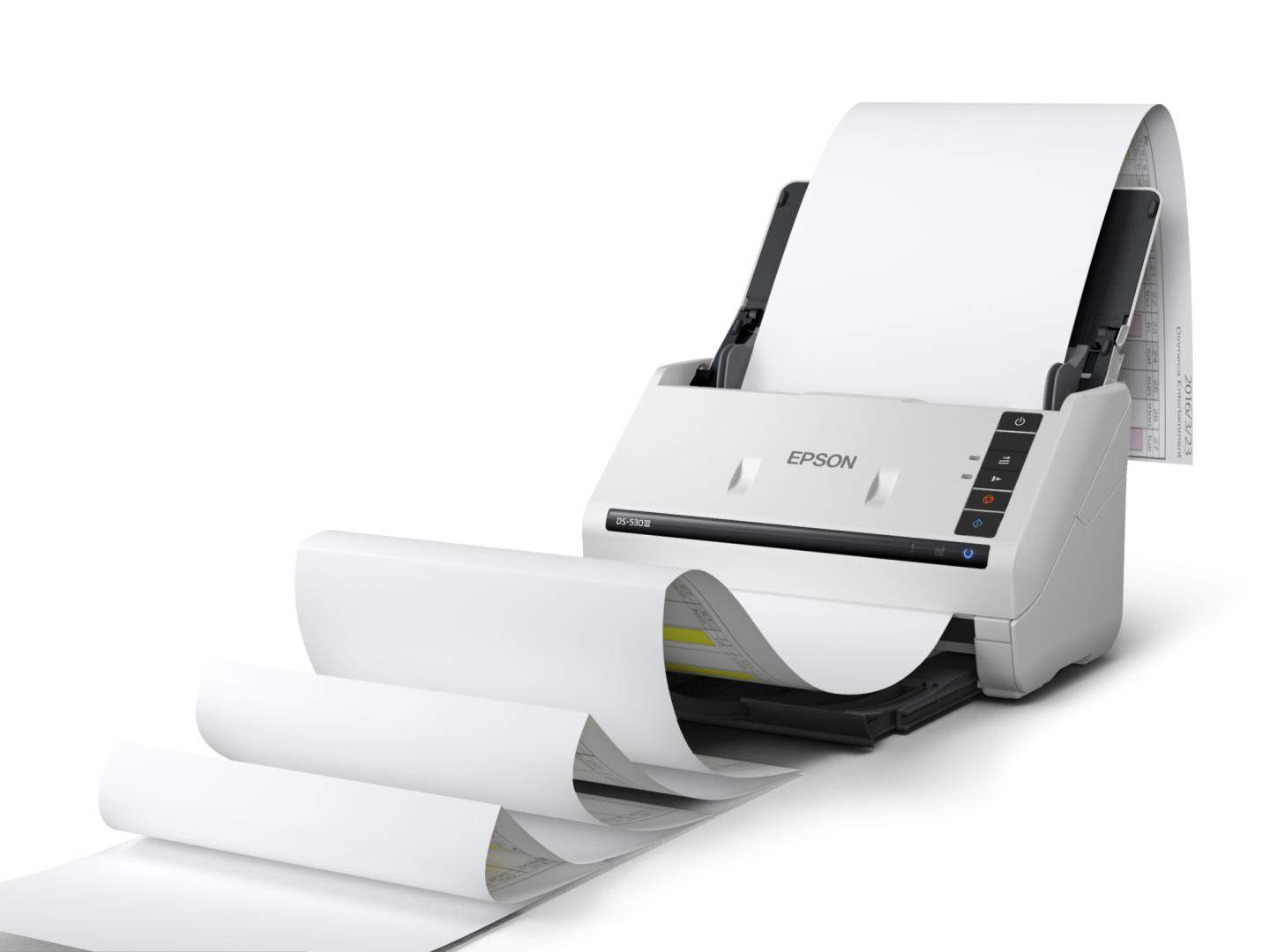 EPSON WORKFORCE DS-530III A4 SCANNER, format A4, Rezolutie: 600 x 600dpi, Senzor ultrasonic, CIS, Sursa lumina: LED, Viteza scanare: 40 ppm, Capacitate ADF: 60 coli, Volum zilnic: 6500 pagini, Duplex, Interfata: USB, Dimensiuni: 296 x 169 x 176 mm, 3.7kg, Format fisiere: BMP, JPEG, TIFF, multi-TIFF, PDF, searchable PDF, secure PDF, PDF/A, PNG, docx, xlsx, pptx.