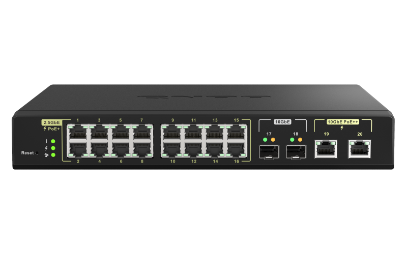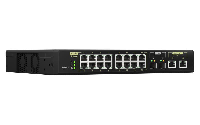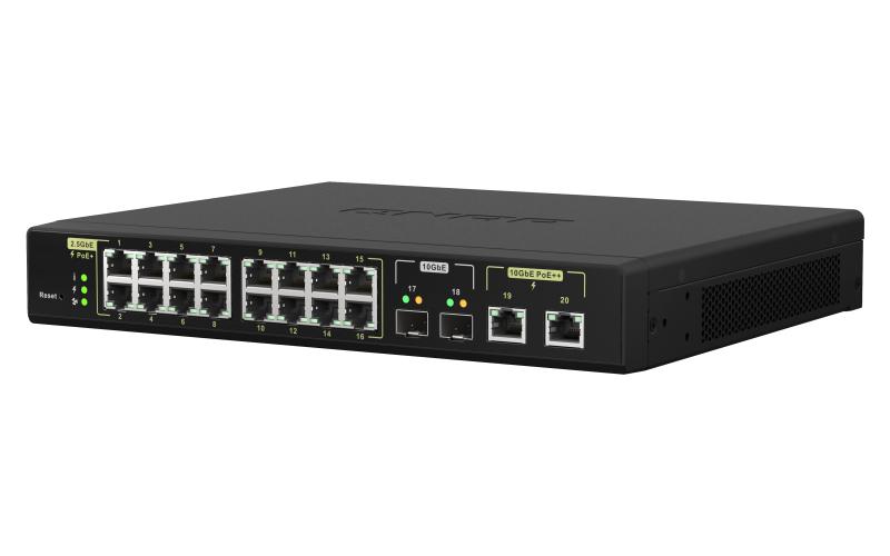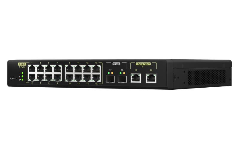 Switch QNAP M2116P CPU Microchip VSC7448-02, 16 porturi 2.5GbE (RJ45) PoE 802.3at (30W), 2 porturi 10GbE SFP+, 2 porturi 10GbE RJ45 PoE 802.3bt (90W), rackmount, web-managed, garantie 2 ani